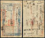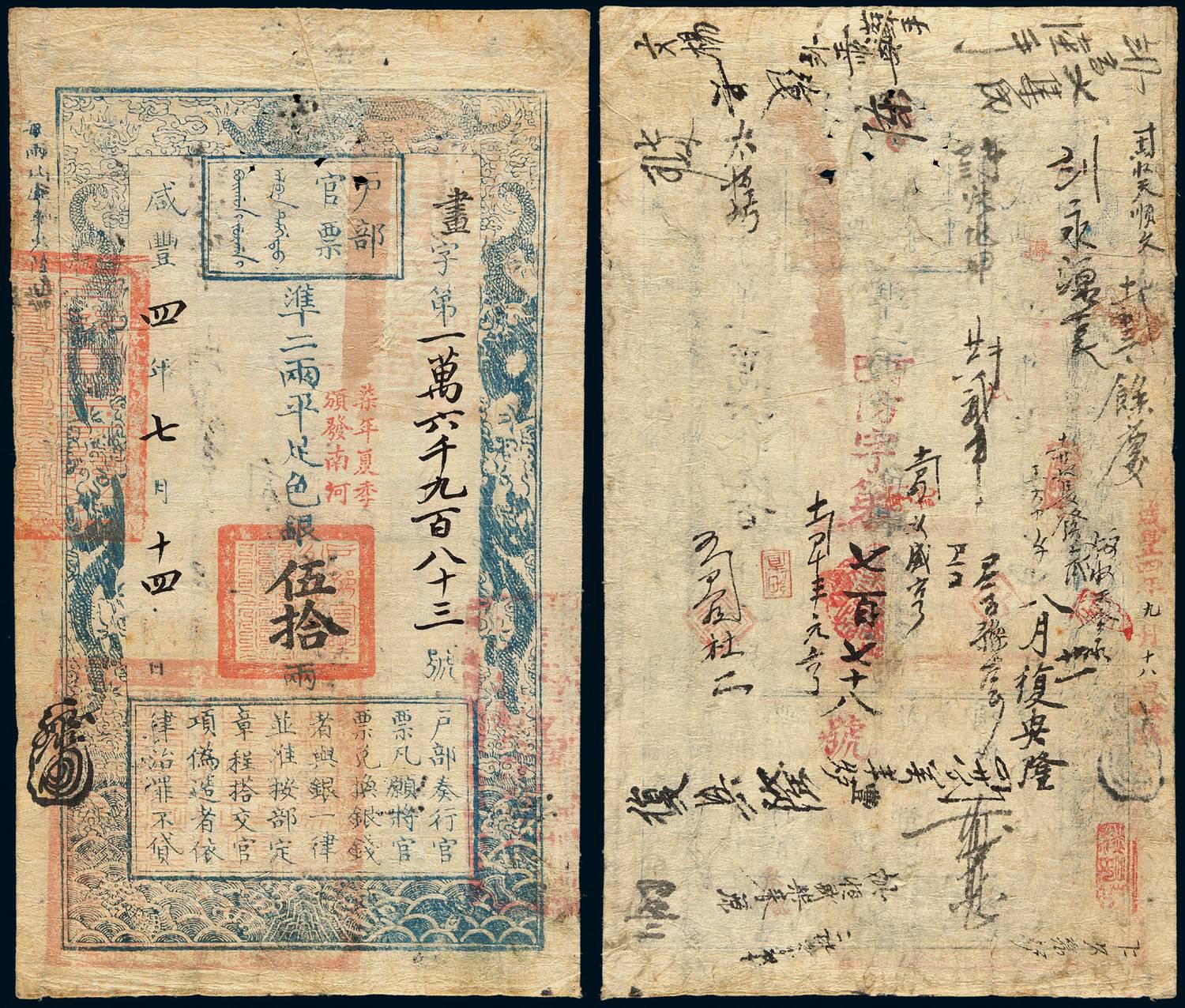 咸丰四年户部官票伍拾两一枚,画字第一万六千九百八十三号,正面加盖“柒年夏季颁发南河”;背盖“丁巳防字第七百七十八号”二次发行编号,编号为手填;另有“咸丰四年九月十八日验讫”、“八月复兴隆”、“四月廿八日义丰炉”、“义集成”、“恒盛柴春源”、“义盛亨”、“收天顺久”、“正顺兴”等大量墨书及戳印,流用频繁,七五成新