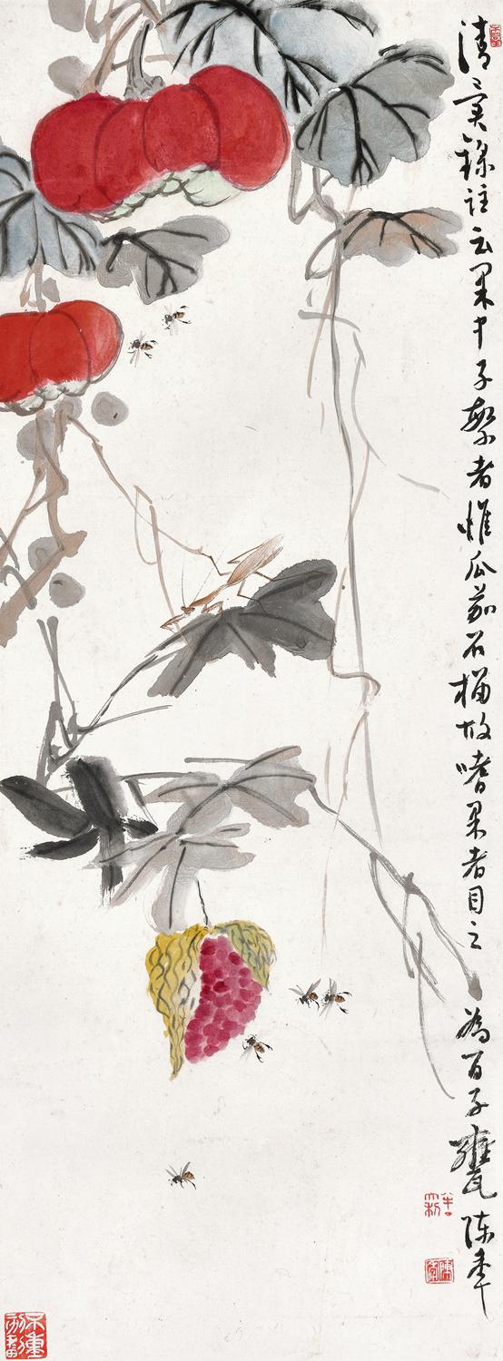 题识:《清异录》注云:果中子繁者,惟瓜、茄、石榴,故嗜果者目之为百子瓮。陈年。