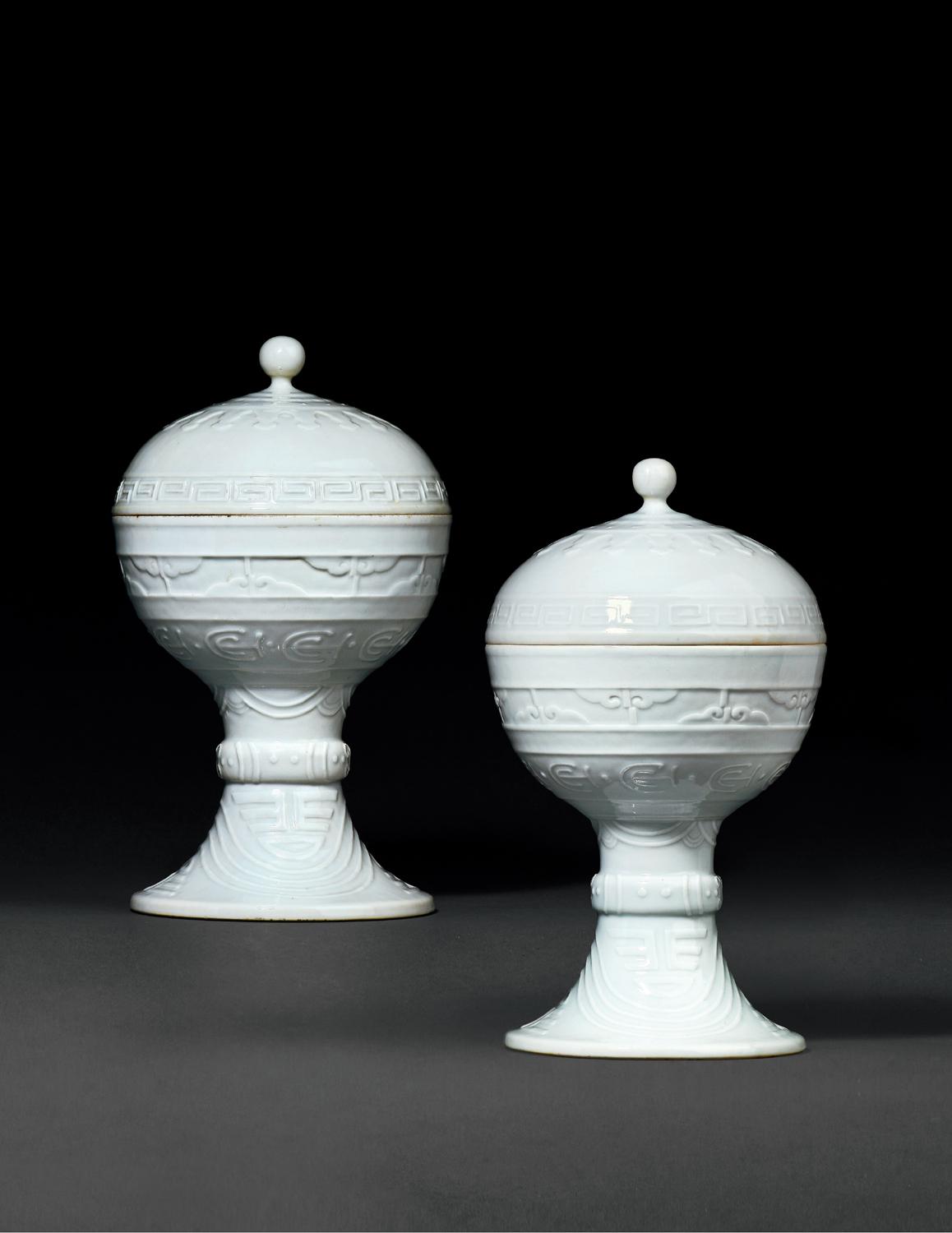 拍品由盖、身两部分组成。盖顶置宝珠钮,高足外撇,自上而下分别饰如意头纹、窃曲纹、波带纹等仿青铜器纹饰。内外壁均施白釉,积釉处略微闪青。