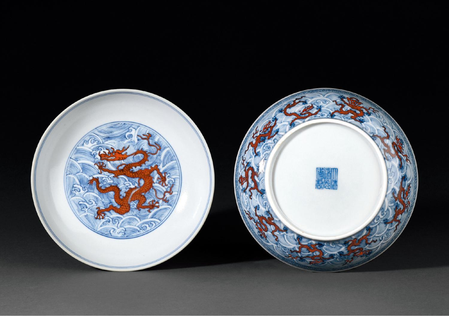拍品盘心和外壁均以青花绘海水,矾红彩饰龙纹,盘心立龙和外壁的九龙姿态各异,腾跃于海浪之中。青花蓝中泛灰,矾红色彩鲜亮。龙头窄平,双眼横排,具有明代中后期龙纹的绘画风格。