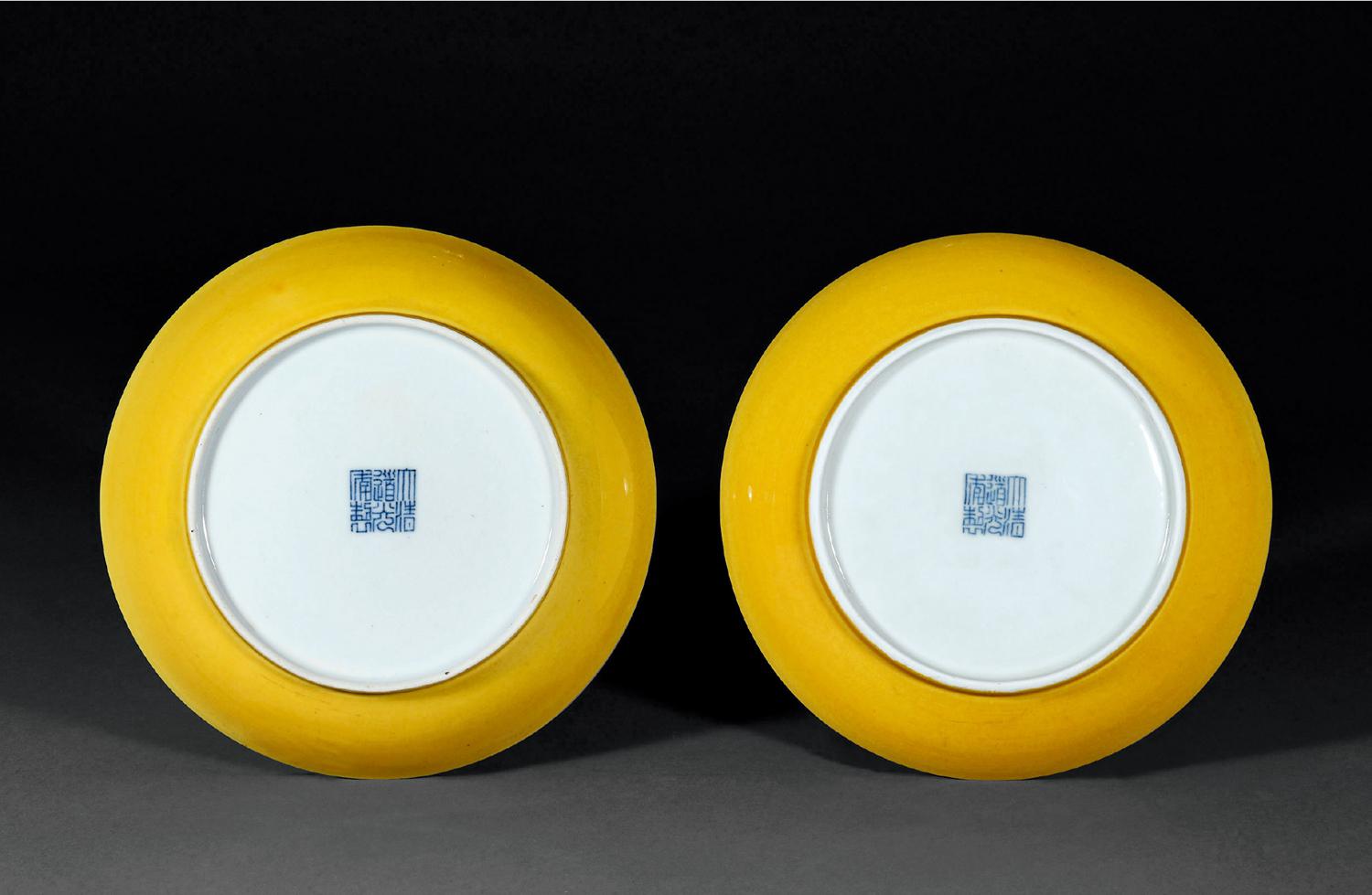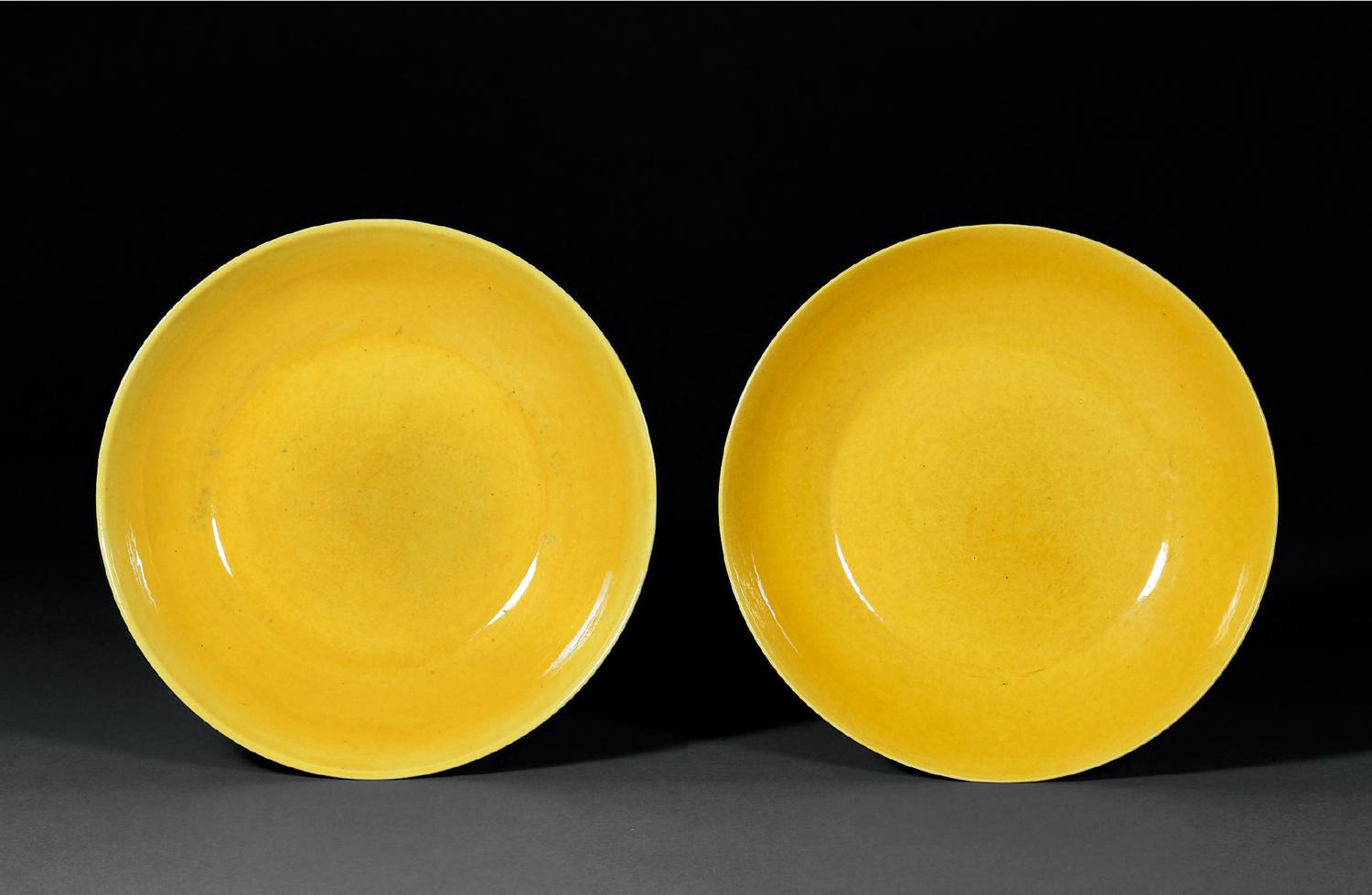 黄釉瓷器始烧于明代,以弘治时期娇黄釉最为知名,清代承袭烧造。拍品盘形周正,内外壁均施黄釉,釉质晶莹润泽。
