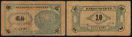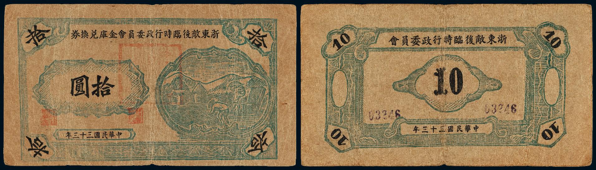 民国三十三年浙东敌后临时行政委员会金库兑换券拾圆一枚,木刻版牛皮纸印刷,票面右侧印割稻图,加盖“本票兑换抗币拾圆”戳记,拍品虽票面陈旧,但保持纸币之原始状态,墨色清晰,已属所见较佳品相,《中国历代货币大系》列珍罕度四星级,极为稀少,七五成新