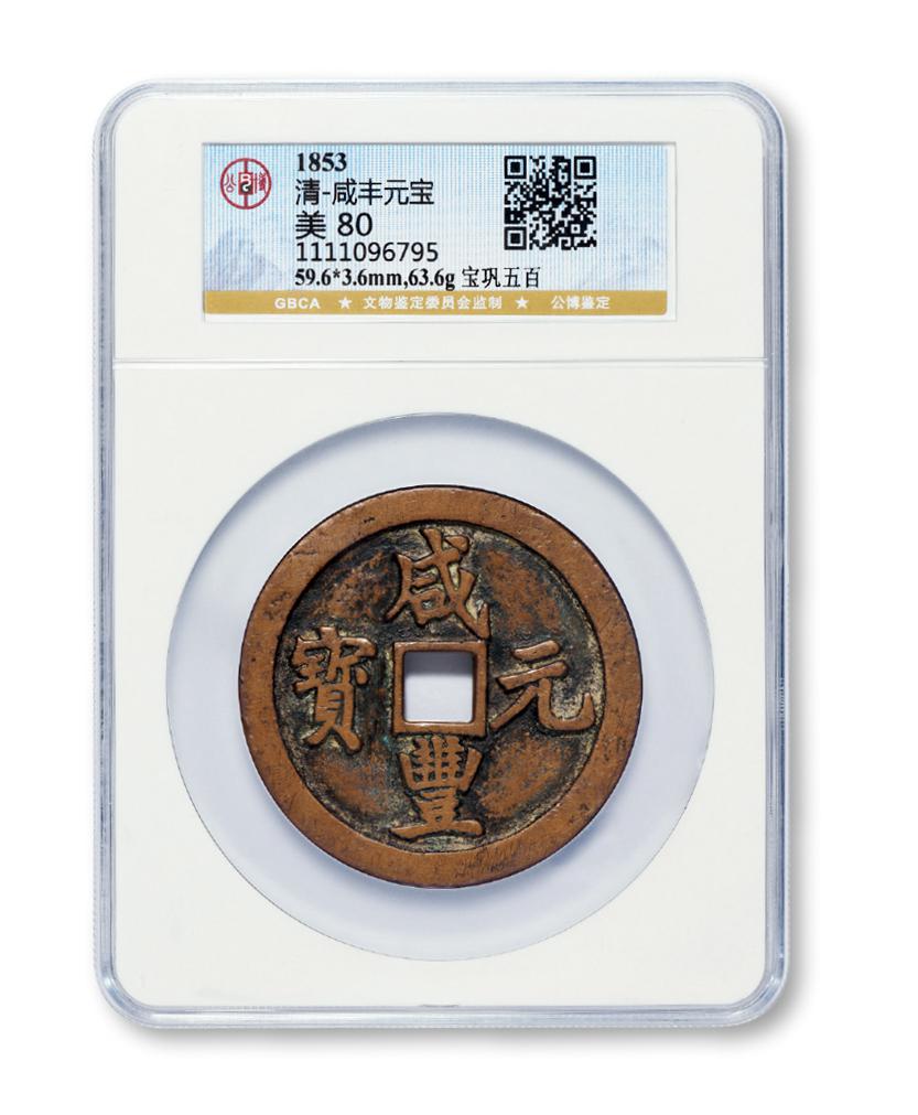清代宝巩局“咸丰元宝”当五百一枚,直径:59.6毫米,咸丰大钱珍罕品,钱文行楷,书法雄矫,素为泉家所重,GBCA 美80