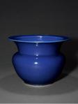 拍品与台北故宫博物院藏清十七世纪末至十八世纪霁青瓷海棠式盆虽器形不同,但釉种、口沿内施釉方式一致,当属同类器。拍品造型承袭自钧窑尊式花盆,广口外撇,尺寸甚大,霁蓝釉色幽靓深邃,呈色均匀。