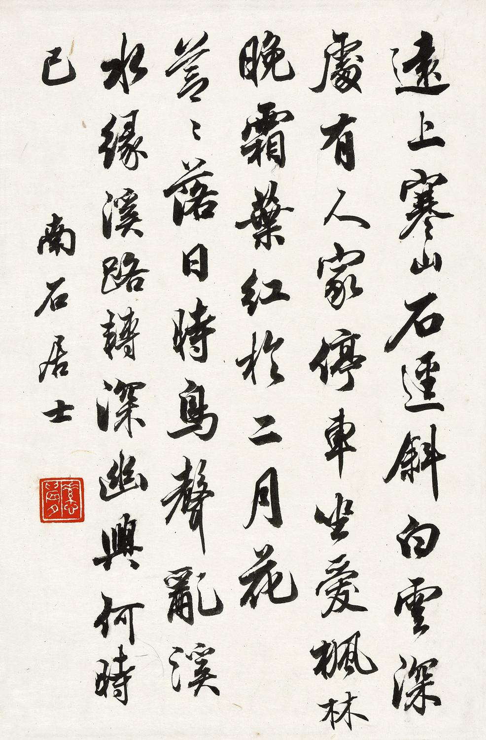 释文:远上寒山石径斜,白云深处有人家。停车坐爱枫林晚,霜叶红于二月花。苍苍落日时,鸟声乱溪水。缘溪路转深,幽兴何时已。南石居士。