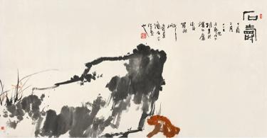 《石寿》系潘天寿六十一岁生日宴会之后的乘兴之作,潘氏生于丁酉(1897年)二月十二日,是帧作于整一甲子之后的丁酉(1957年)二月十一日,题曰“与艺院同仁雅集于楼外楼”,即友人于杭州楼外楼为潘天寿组织的庆生酒宴,如此特殊的作品,在潘天寿存世画作中非常少见。