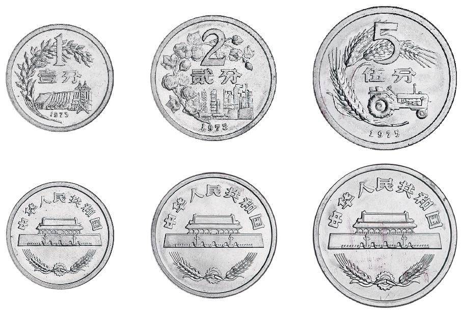 此套样币正面主图案分别为1分大豆、水坝,2分棉花、工厂,5分麦穗、拖拉机,中文大写面值“壹分”、“贰分”、“伍分”置于图案中央位置,同时于上方镌阿拉伯数字面值,下方为纪年。背面图案则与之前所见“农作物”试铸样币有所不同,非国徽图,而是天安门与麦穗齿轮图,铸造颇为精美。然而,由于时处“文革”末期,这套硬分币的设计方案最终未被采用,铸成的少量样币也大多被销毁,流传于世如吉光片羽,堪称中国现代流通硬币的馆藏级珍品。