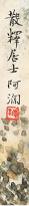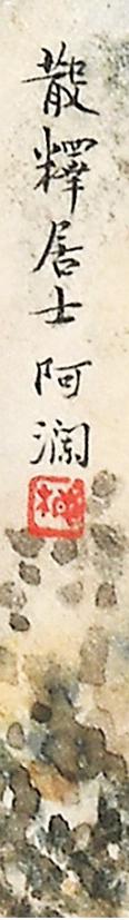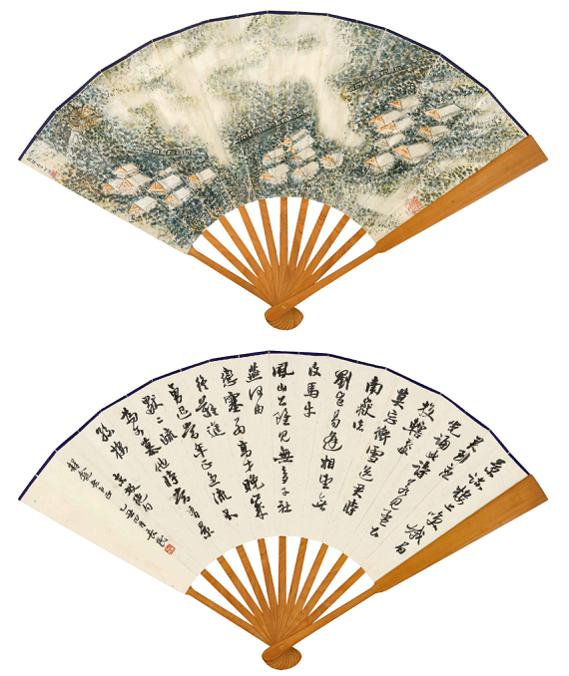 梅兰芳认为绘画与京剧有相通之处,于绘事颇下功夫,问道于王云、陈师曾、金城、姚华、汪吉麟、陈半丁、齐白石等一众名家,如此师资,诚为侪辈所难企及。梅氏作画,以花卉、佛像、人物题材为主,山水洵不多见,而《城关云岚》构图满密,状写城墙内外丛树密布、屋舍错落之态,落墨一丝不苟,留白表示的云雾亦颇生动,显然是倾力所为。此箑画风,既具陈师曾作品的生活气息,点厾技法又有姚茫父的韵味,甚至依稀看出金北楼、萧谦中等京津名家的意态,可视为民国初年北京画坛时风之一例。梅兰芳名澜,但作画极少署之,目前仅见于给李宣倜、齐如山等极亲近者,此箑落“阿澜”,钤“红萼楼”,殊为难得。