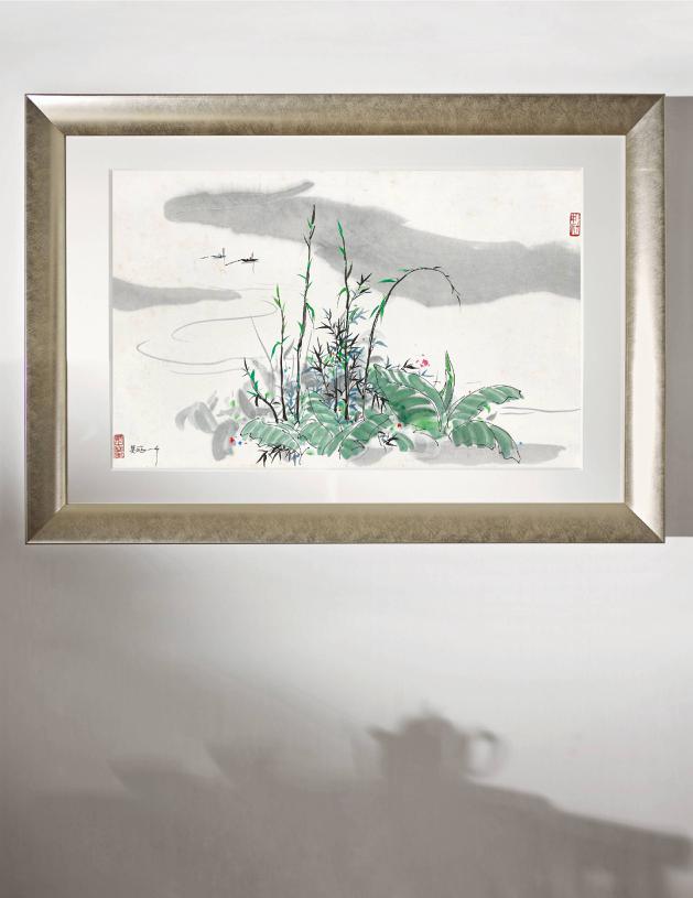 画家以高度抽象的图式来表现青衣江的柔美气质,芭蕉和竹枝为代表的植物色彩丰富明丽,占据画面中心,纵向的线条打破了横向的布景,类似构图在他的《太湖》、《十渡河畔》等作品中也有使用。平静的江水蜿蜒流过,两叶扁舟浮在江面,远岸以淡墨表现,朦朦胧胧,似真似幻。通幅构成严谨考究,色彩对比强烈,格调清新秀丽,饱含着吴冠中的乡土情感和具体入微的现实感受。