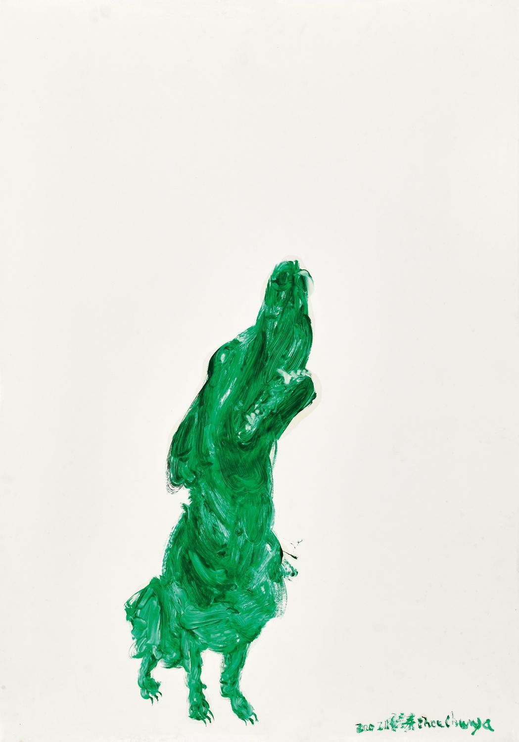 本幅《绿狗》创作于2002年,一只嗥叫的绿狗位于白色画面中央,笔触狂放,色彩浓烈,虽然色调单一,但浓淡变化的绿色极具张力,暗示出不加修饰的动物原始欲望。或许是受“八大山人”绘画及留德经历的影响,周春芽将德国的新表现主义与中国的水墨画手法同时融入到创作之中,用笔极为精炼,一笔不多,一笔不少,流动的运笔体现了“绿狗”的力量与速度,笔触则展示了其质感与触感,既有文人花鸟画简洁的形态,也不失雕塑的体量感,画面中大面积的留白处理,使主体更具动感与活力。周春芽在一次采访中提到;“‘绿狗’系列是我在画布上做的雕塑,是以雕塑的触感来重构文人花鸟画,是我在绘画形态中深入研究的成果。”