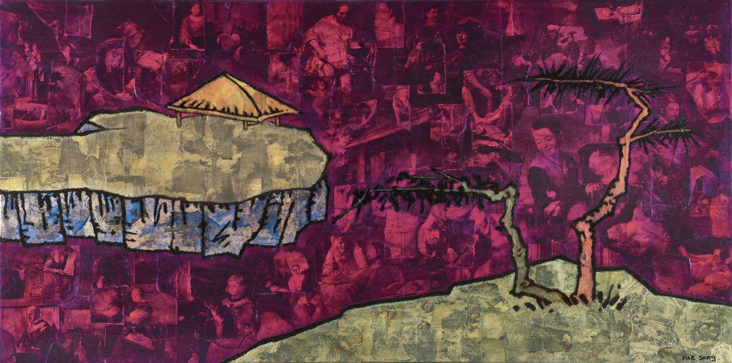 画家选取元代画家倪瓒作品中最具代表性的物象:树和亭,采用“一河两岸”的标志性构图方式,以达到“倪家小样山亭子,画得苍苍落木风”的艺术效果。而背景则是拼贴而成,素材均为欧洲绘画中的经典人物形象。作品熔传统与现代、中国与西方元素于一炉,使外来的文化符号成为画家自身艺术的形象资源,建立起独特而鲜明的创作风格。