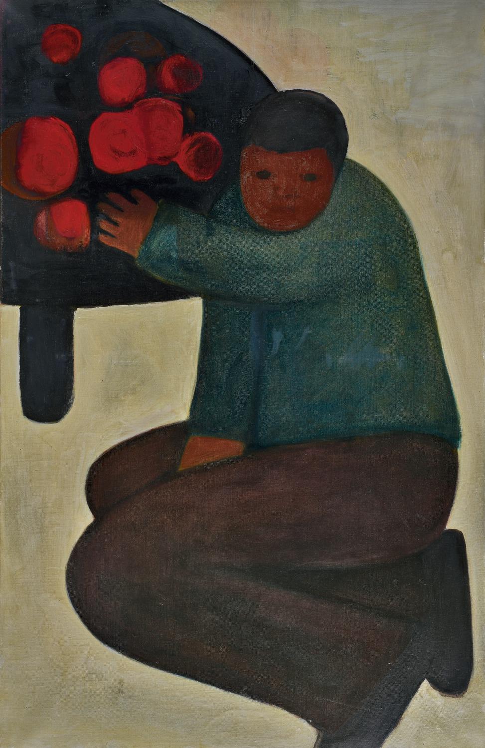《小孩》创作于1968年,正是贺慕群在巴黎盛开艺术之花的时期。画面人物造型简约,以大面积色彩平涂概括物象,削弱空间体积感,给人直面现场的视觉冲击。小孩天真地面向观者,左手却悄悄伸向桌上火红的苹果,画家敏锐地观察到这一日常细节并放大特写,充满孩童般的稚拙率真。作品让人真切感受到她所抒发的女性最本质的生存意识,以及由此引发的母性思索,从而理解她渴望新生、悲悯贫困的宏大胸怀。贺慕群正是以母性视角特征为绘画创作的切入点,定格一瞬间,那是一位母亲对孩子深深爱意的表达,成功地将写实形象和抒情意境融汇在一起,用油画语言调和作品中的人物造型和精神层面,于无声处,传达其审视生命的朴素哲思。