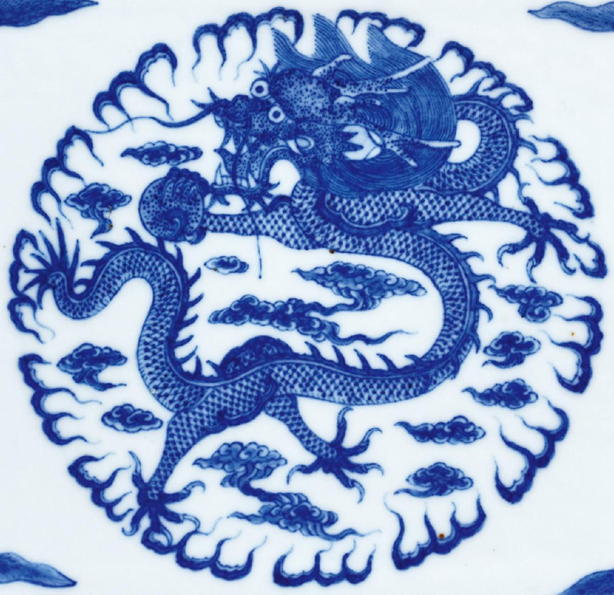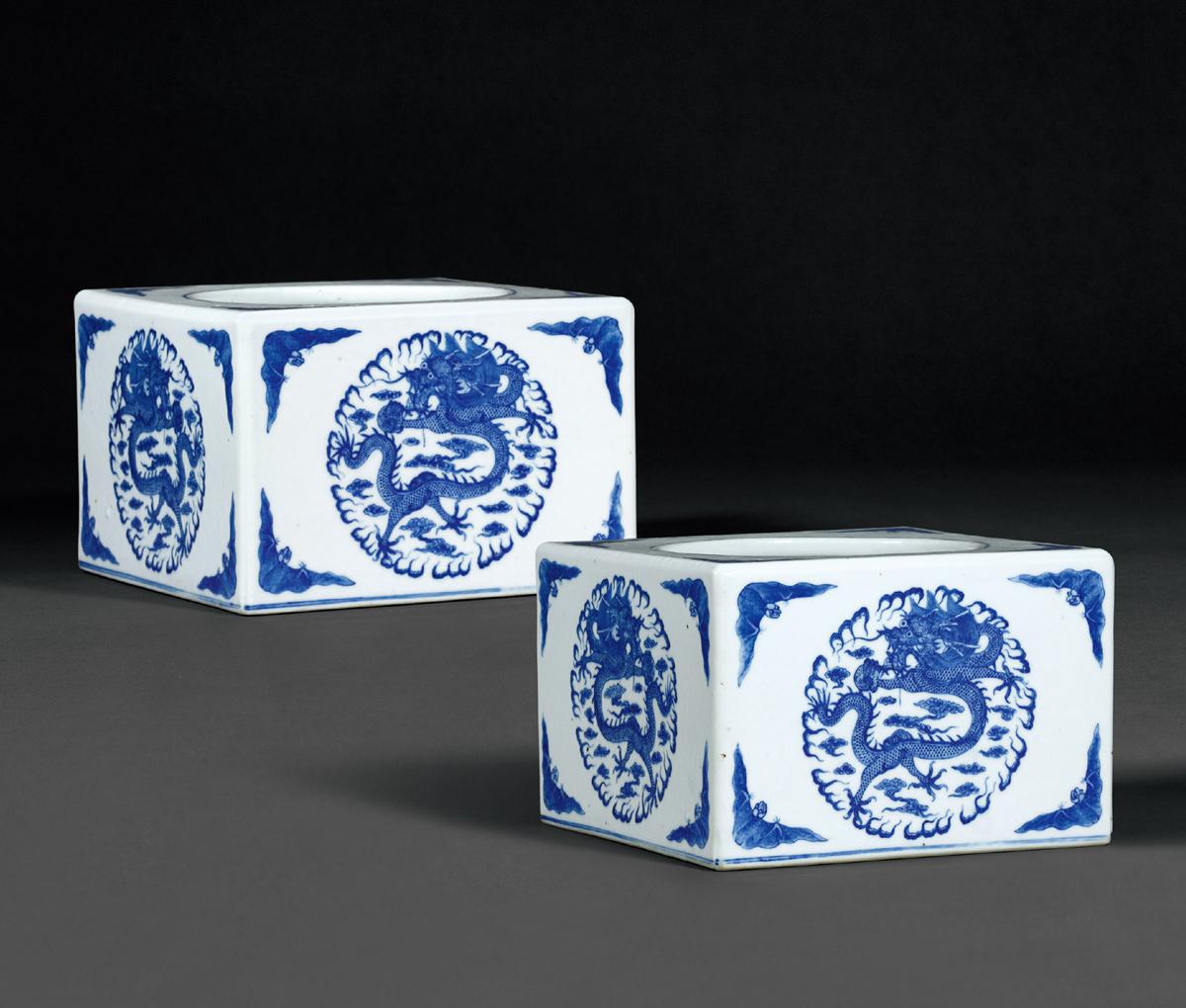 洗呈方形,造型规整,顶开圆形口,四角饰青花蝙蝠,四侧面均以青花绘蝙蝠围护团龙纹。底部设八枚支钉,工艺考究。