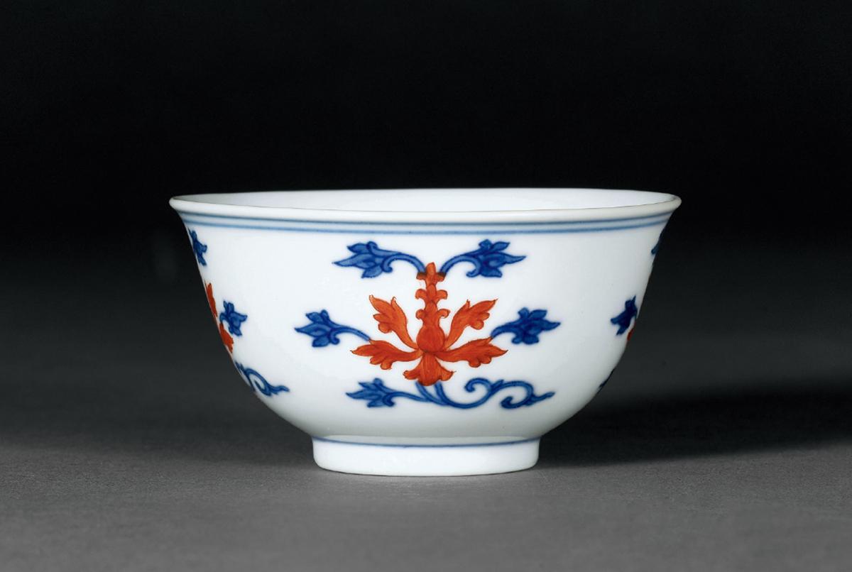 拍品杯形小巧规整,釉面光洁莹润,外壁饰折枝花四朵,以矾红彩绘花朵,青花绘枝叶。画面布局疏朗,笔触细腻。