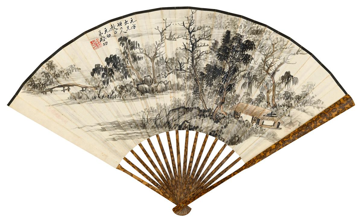 启功早年曾拜贾羲民、吴镜汀习画,又以晚辈预身松风画会,向溥雪斋、溥心畲等同族请益,取法与宗室、遗民的品味一脉相承,主以正统派的文人画风格,是箑正面为1940年代初期作品,笔法以四王为根柢,参入明人笔致,注重笔墨层次,画风清逸华滋。