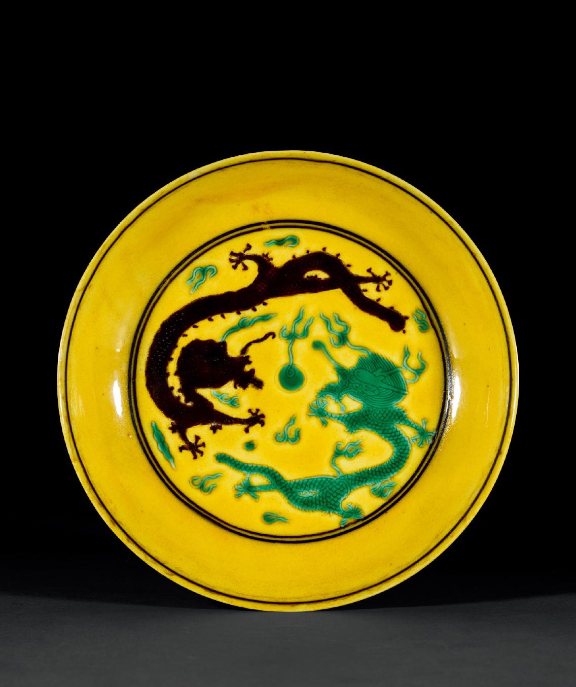 拍品盘形规整,内外壁以黄釉为地,盘心饰紫、绿彩双龙戏珠,外壁对称饰绿彩云鹤纹。绘画细腻,填彩精准,发色鲜艳。