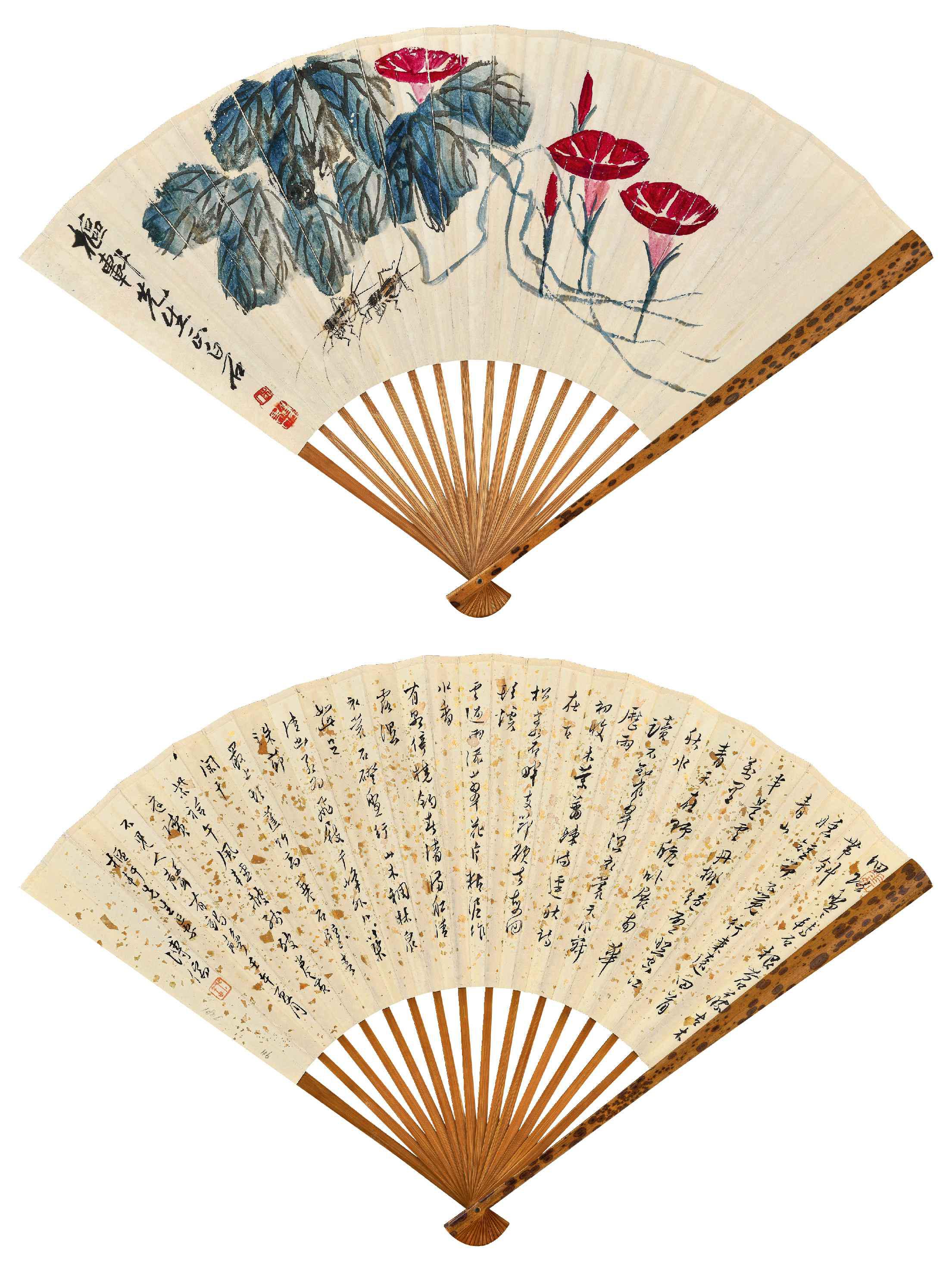 扇面依势绘几株牵牛,缠绕的枝蔓间生出五朵花,盛开者,先用曙红勾出弧线花冠,再用几笔涂抹出内壁纹理;含苞者则用一两笔竖线画出。叶片以花青涂抹,素墨勾筋,色墨交融,湿气淋漓。左下两只蟋蟀以枯墨细笔勾画,触须长扬,腿足细劲有力,淡赭略染身躯,简括而逼真,鲜活生动。