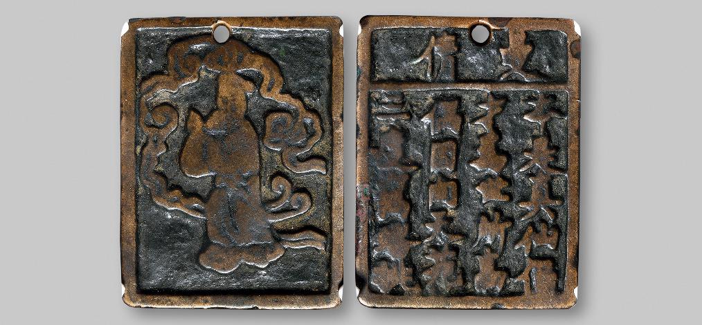 宋代曼倩像长方形选仙钱一枚,长:35.7毫米,宽:27.2毫米,正面人物为西汉辞赋家东方朔(字曼倩),背配五言绝句“本是真仙侣,才为世所高。偶因向天苑,三度窃蟠桃。”讲述东方朔三盗王母娘娘蟠桃的故事,上穿一小孔,应为佩戴悬挂之用,边角轻微磕碰,GBCA 美78(06)