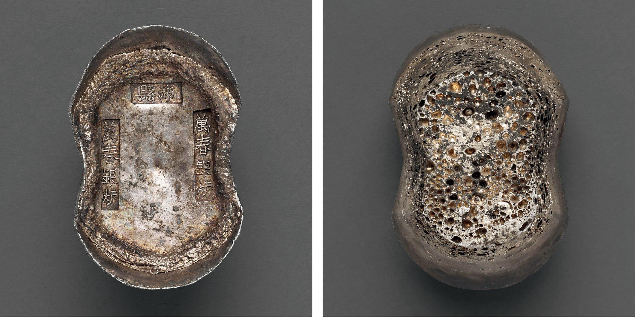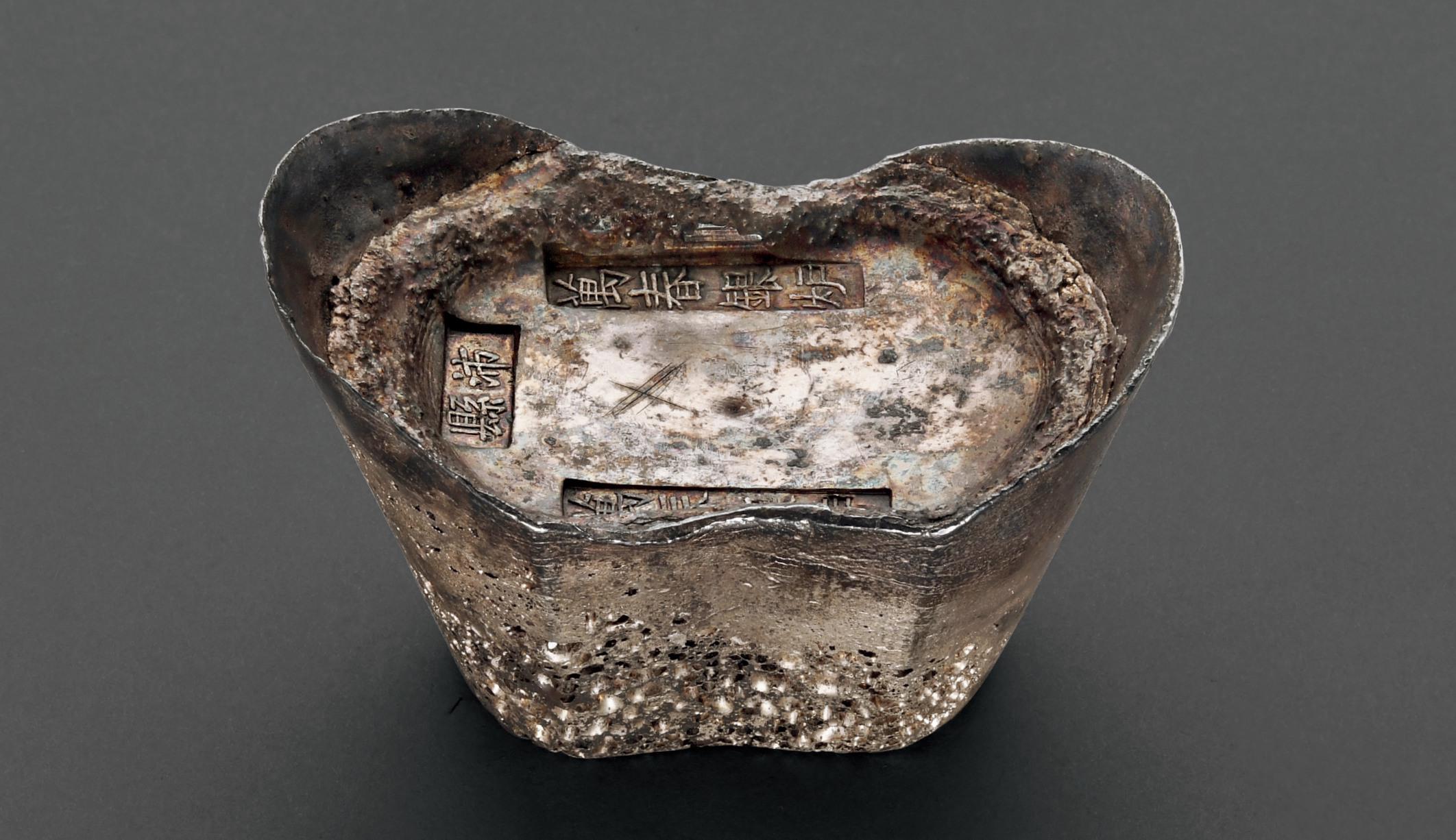 清代江苏“沛县 万春银炉 万春银炉”五十两银锭一枚,重量:1864.3克;沛县位于苏、鲁交界之地,是汉高祖刘邦故里,江苏北部重要门户,因与山东省微山、鱼台毗连,在长期商贸活动中,二地铸锭风格互有影响,如此枚打有“沛县”名的银锭实物即采用了山东五十两大宝形制,迄今国内外相关文献目录均未见记载,公开拍卖仅此一枚;拍品砸戳方正端丽,字口峻拔,宝面自然氧化形成老彩包浆,光泽强劲,底部蜂窝亮丽,孕含数颗银珠,属江苏五十两大宝之特殊品种,GBCA MS61+