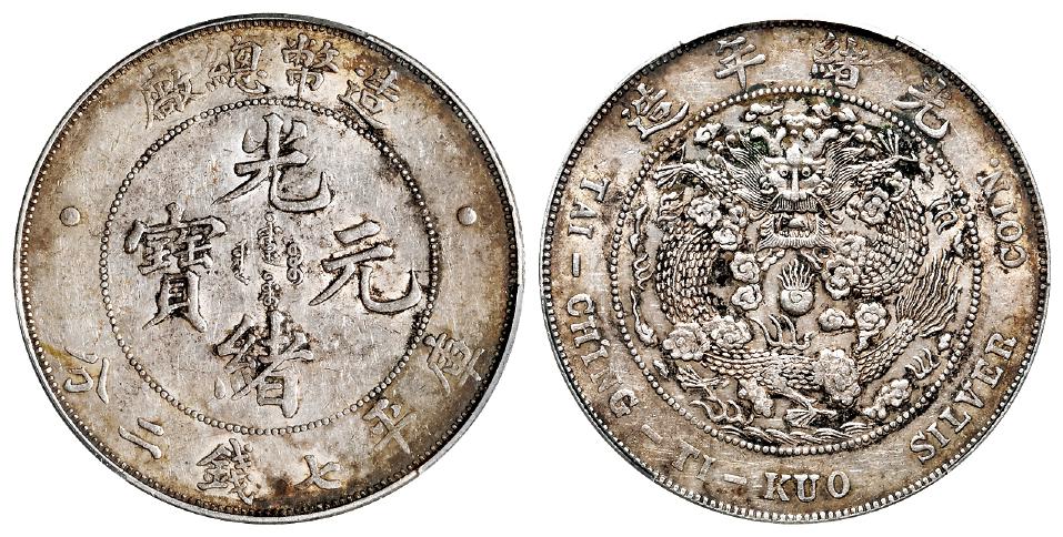 1908年造币总厂光绪元宝库平七钱二分银币一枚,Y-14/LM-11,原色原味,底光尤存,PCGS AU53