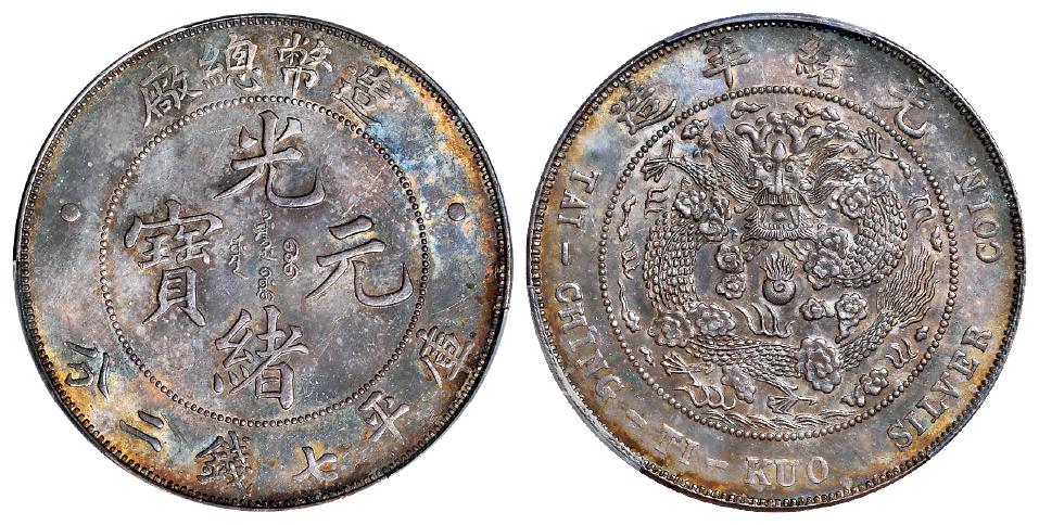 1908年造币总厂光绪元宝库平七钱二分银币一枚,Y-14/LM-11,铸造精美,龙麟满打,双面呈较深五彩包浆,色泽绚丽,品相极佳,PCGS MS63