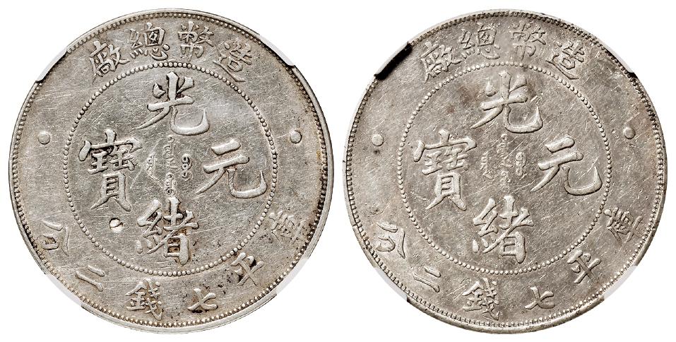 1908年造币总厂光绪元宝库平七钱二分银币二枚,Y-14/LM-11,其中一枚字面版底打流通小戳一处,NGC XF Details、AU Details