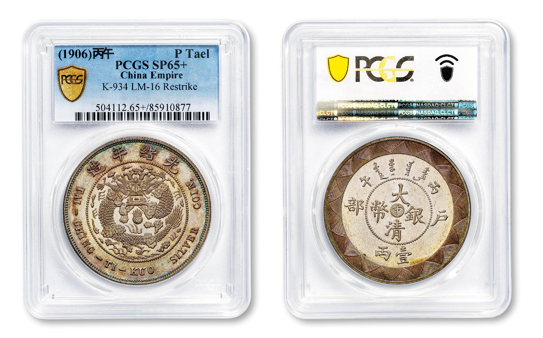 1906年丙午户部大清银币“中”字壹两样币一枚,K-934/LM-16,户部天津造币总厂试铸,其时因“圆两之争”尘埃未定,仅试铸,未发行,存世稀少,历来被老一辈藏家奉为收藏进阶之关键品种;样币铸造工艺精湛,类镜面版底细腻光洁犹如绸缎,其上图文细致精美,边齿锋利;与此同时,样币边缘环状氧化,形成五光十色的悦目虹彩,与靓丽版底相得益彰,更富艺术感染力,作为集罕少品种与顶级品相于一身的中央系列龙洋珍品,其价值必将日益凸显,PCGS SP65+,目前为该公司评级纪录唯一亚军分,仅一枚冠军分高出此枚半分