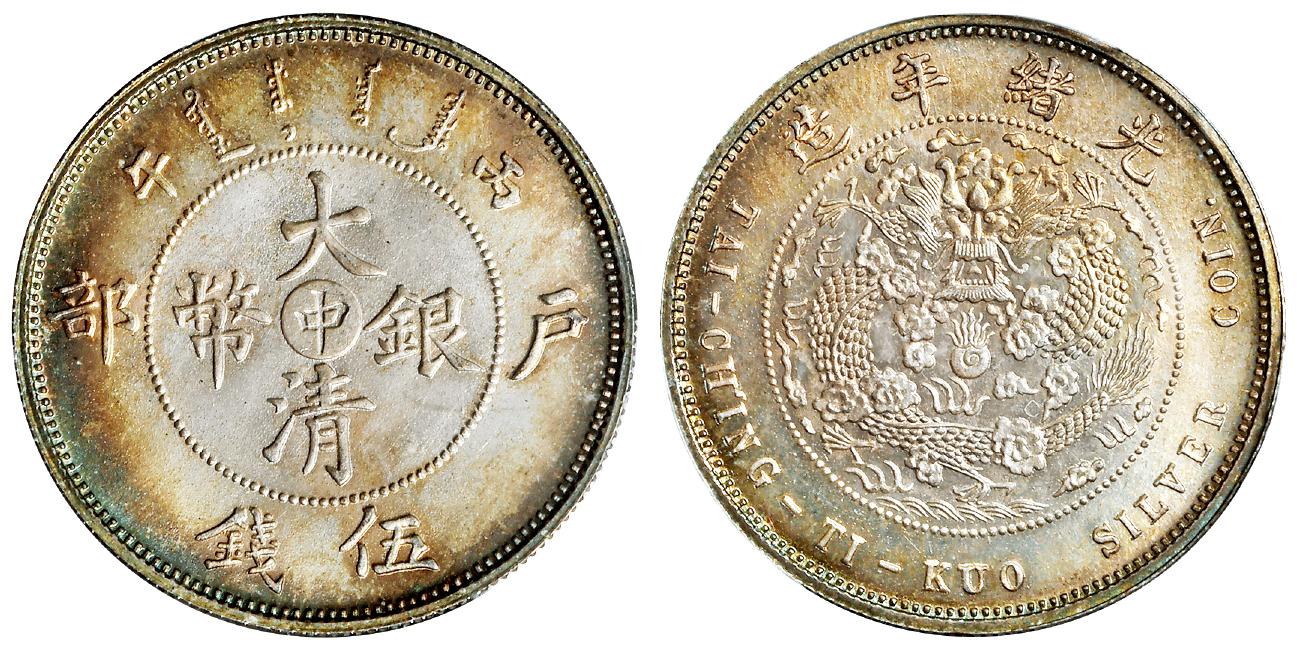1906年丙午户部大清银币“中”字伍钱样币一枚,K-935/LM-17,户部天津造币总厂试铸,未发行;样币铸造精美,类镜面版底完美无瑕,环状五彩包浆动人心魄,PCGS SP66,目前为该公司评级纪录之季军分