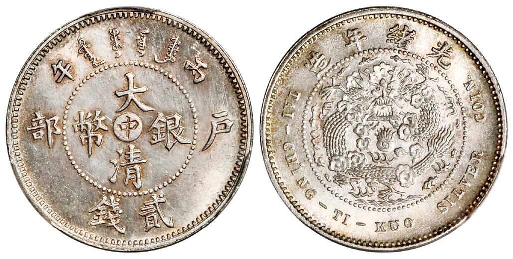 1906年丙午户部大清银币“中”字贰钱样币一枚,K-936/LM-18,户部天津造币总厂试铸,未发行;样币铸打出色,版底薄彩银光通透莹亮,品相上乘,PCGS SP65+,目前为该公司评级纪录唯一亚军分,冠军分仅高出半分