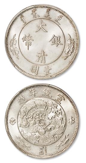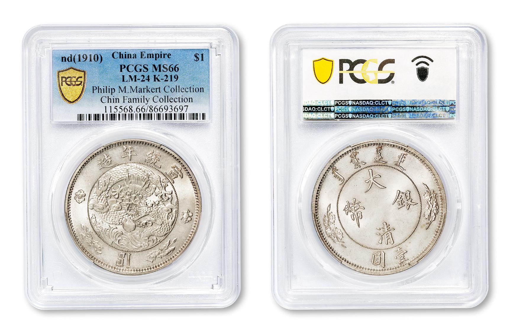 宣统年造大清银币壹圆“$1”一枚,K-219/LM-24,奥地利维也纳造币厂设计制模,1910年度支部天津造币总厂铸造,小批量生产并未发行;拍品系钢模初打,高边郭,内齿锋利,图文深峻精美,缎面版底细腻无痕,满溢亮泽车轮原光,其品相于水龙系列银币堪称翘楚,PCGS MS66,目前以唯一最高分,独霸该公司评级纪录之榜首