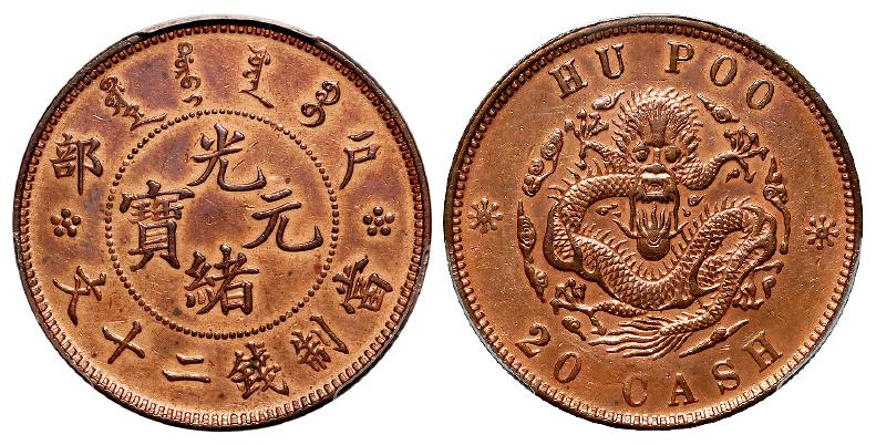 1903年户部光绪元宝二十文铜币样币一枚,Y-5/CL-HB.08a,属试样或留档样币性质,币坯制作精良,压力十足,马齿凌厉,图文深峻精美,底版充盈红铜光泽,精整度明显优于流通币,与中国钱币博物馆馆藏之户部二十文留档样币风格一致,存世极罕;据周沁园、李平文编着《中国机制铜元目录》记述,户部二十文样币目前私人收藏仅有二枚,另据孙浩先生考证,此版户部二十文流通币发行的时间和地点,并非晚清的天津总厂,而是1917年由湖北的武昌厂制作,PCGS SP AU Detail/92