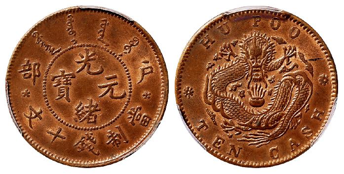 1903年户部光绪元宝十文铜币一枚,Y-4/CL-HB.04,边花阴蕊版,全深打,铜光颇佳,PCGS MS63RB,目前为该公司RB级评级纪录唯一冠军分