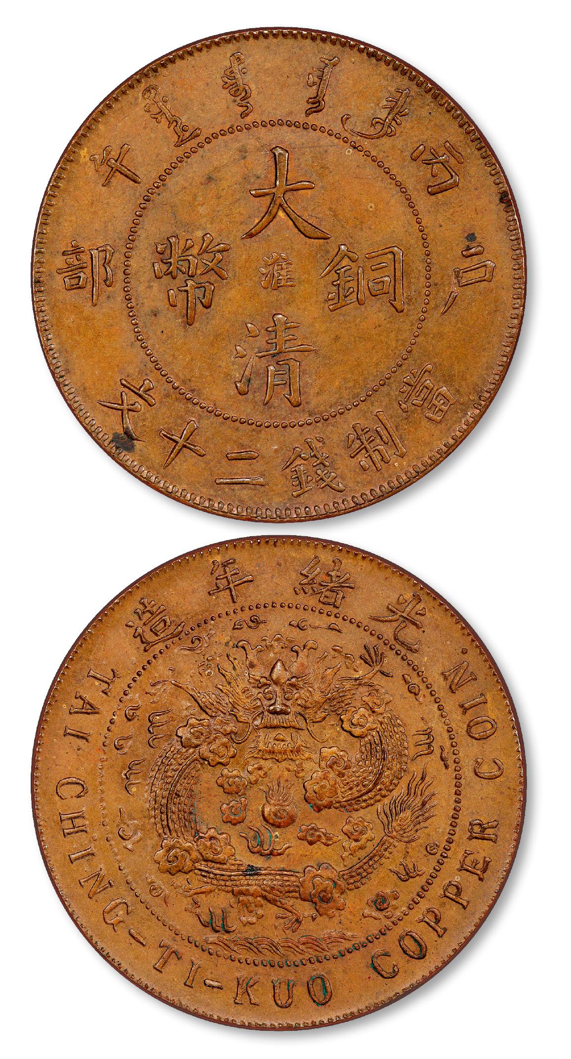 1906年丙午户部大清铜币中心“淮”二十文样币一枚,CCC-272/CL-TK.21,清江浦铜元局仅量产了“阴淮”与“阳淮”十文铜币,二十文面值者目前虽已知四枚存世,但因缺乏史料佐证,业内研究推测认为,应属试样或短期搭造性质;在存世的四枚“淮”二十文当中,仅两枚品相可达完全未使用一级,拍品即其中之一,另枚则由着名收藏家孙鼎捐赠入藏上海博物馆,余二枚则为流通品相,故“淮”二十文铜币存世可谓稀若星凤,被列中国近代机制铜币十大名珍;拍品系钢模初打,底版无伤,图文压印饱满清晰,细节处无一不精,颇具样币风范;同时,此样币出身名门,传承有绪,在2018年4月香港SBP钱币365bet足球投注网站_365bet体育在线网站_体育平台送365彩金