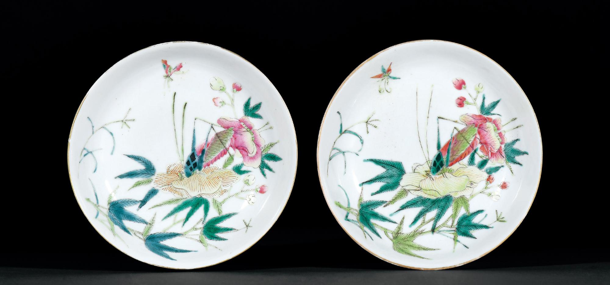 粉彩盘一对,盘心绘蜀葵盛放,一只蚂蚱停于其上,蝴蝶翩翩飞舞,纹饰描绘较为细腻,一派生机盎然的秋日景象;外壁饰三组折枝花卉纹。
