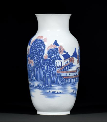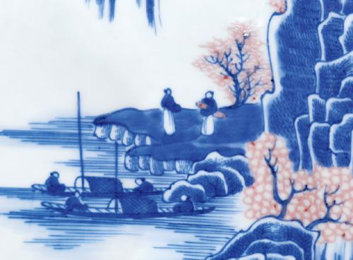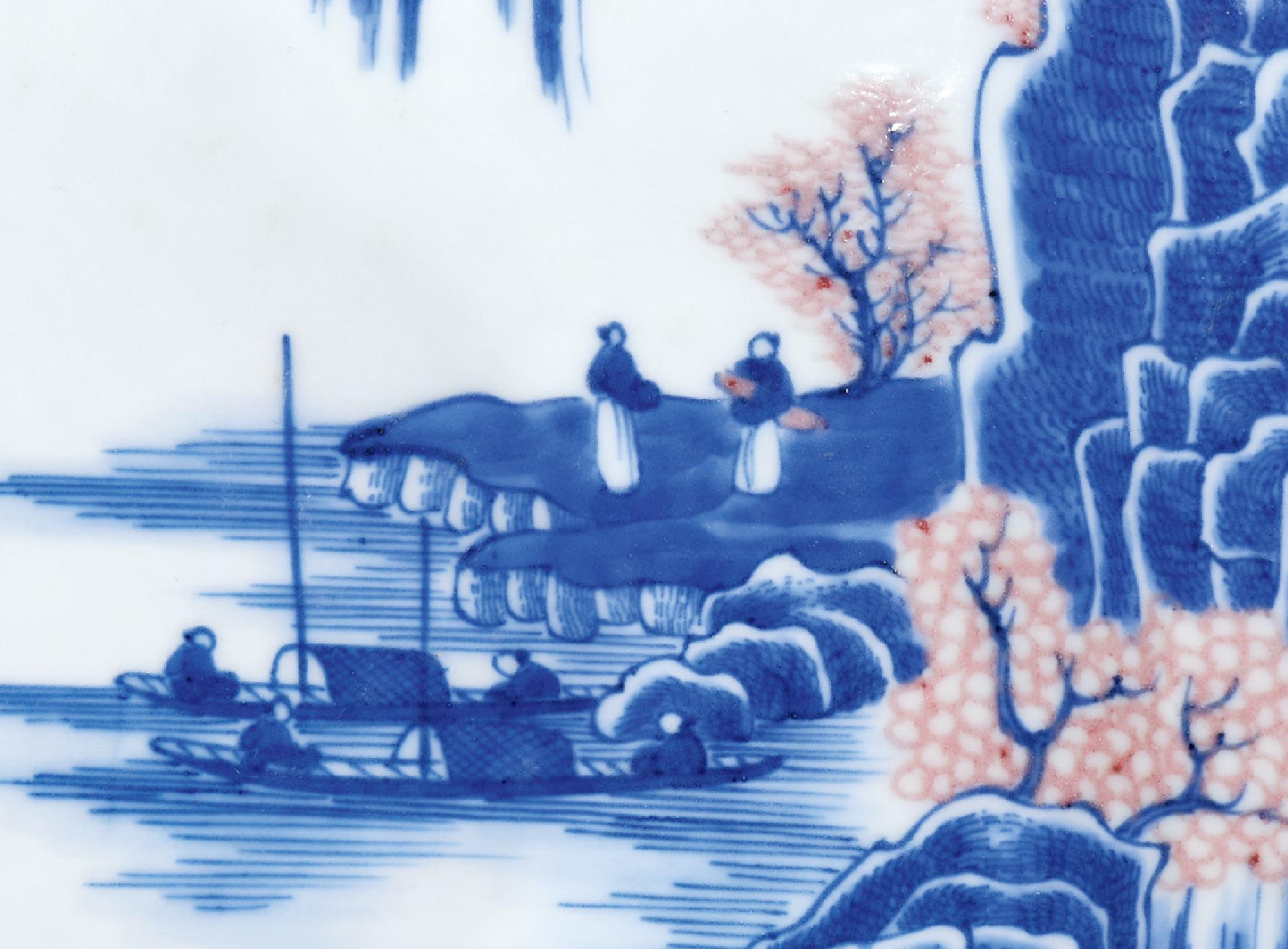 拍品通体绘青花釉里红山水人物图,群峰耸峙,山石嶙峋,楼阁、水榭中文士或观景,或对弈,悠闲安逸,水面扁舟叶叶,奇峰之险与水面之静形成对比,釉里红描画树木、栏杆,红色点缀在发色沉稳的青花画面中,有画龙点睛之效。