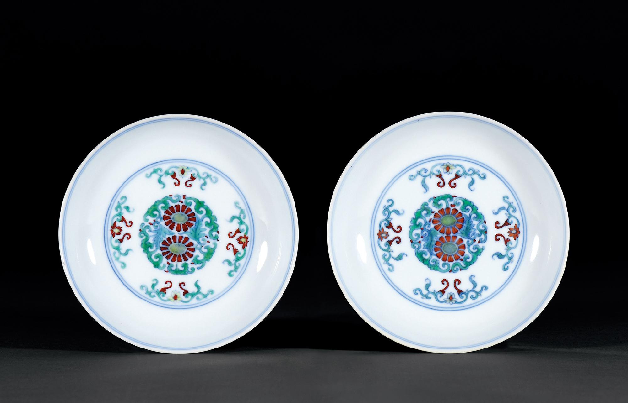拍品盘心和外壁绘团菊纹,隙地间饰折枝莲,器形秀巧,胎质细润洁白,矾红、翠绿、娇黄敷彩明丽,青花淡雅怡人,为雍正斗彩追摹成化风华之佳作。