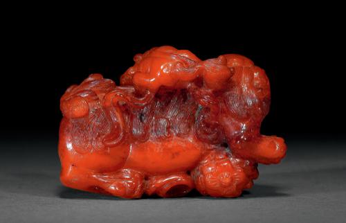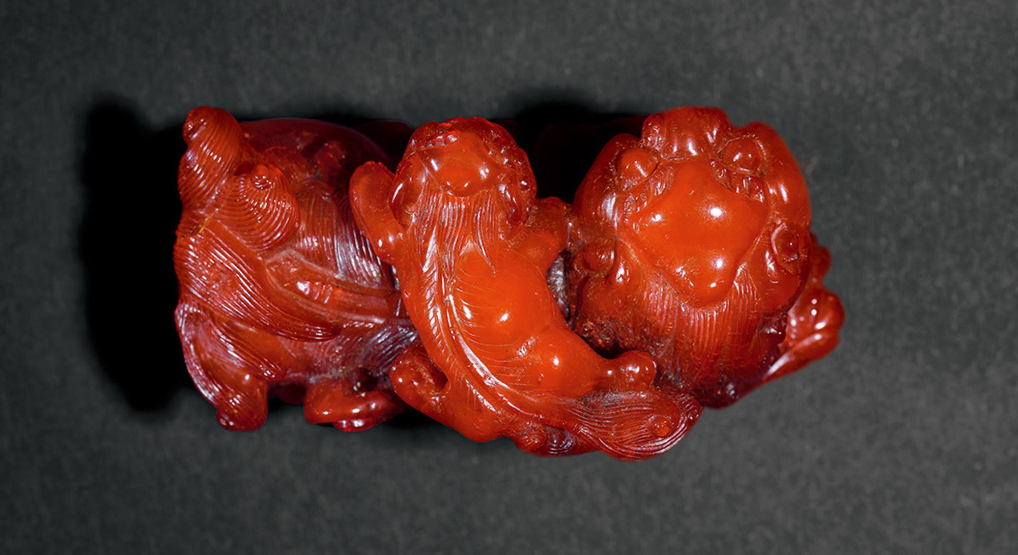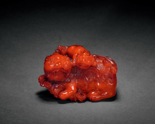 拍品取大块蜜蜡精雕而成,呈橘皮红色,质地温润。圆雕太狮回首,前爪戏绣球,双眼睁若铜铃,背部鬃毛分向身体两侧披散,尾部蓬松上扬覆于背部;少狮攀附在其脊背之上,神态与太狮如出一辙。细节刻画精当,绣球以花朵装饰,尾巴分叉蜷曲如花,是明代文房器物中不可多得的精细之作。