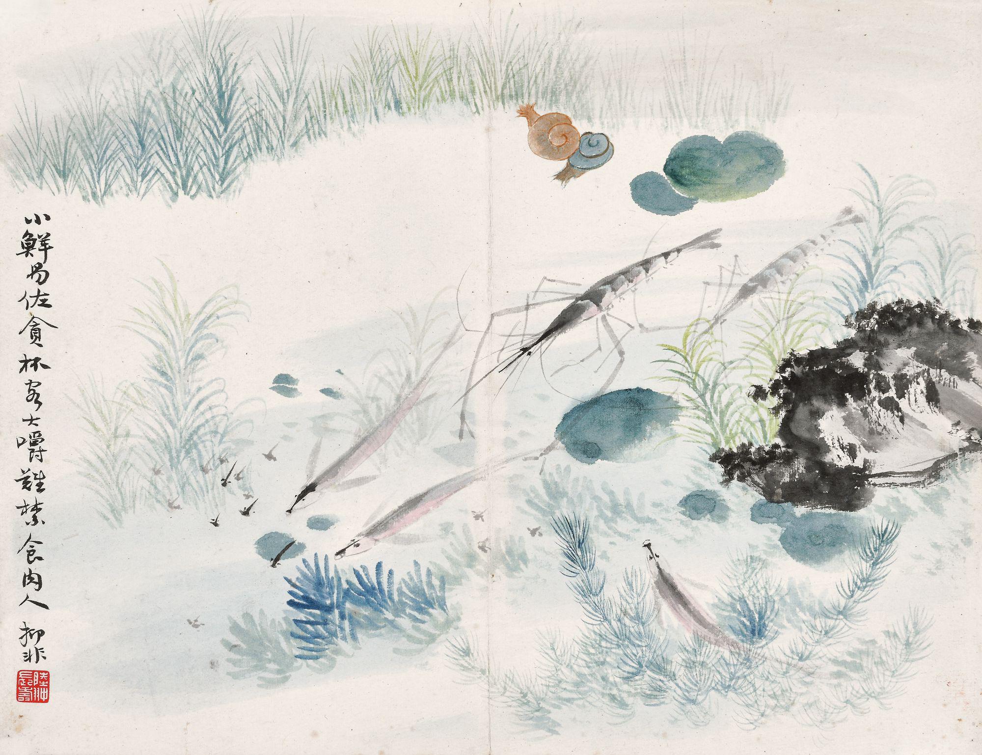 题识:小鲜易佐贪杯客,大嚼难禁食肉人。抑非。