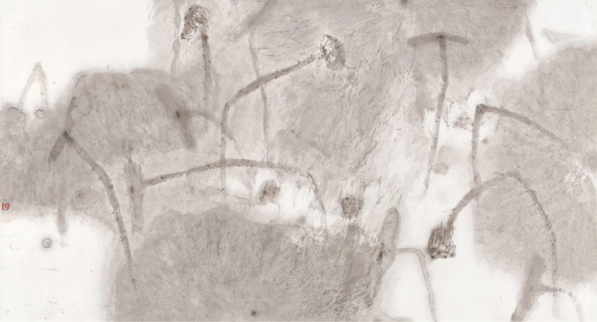 《如梦(暗香浮动月黄昏)》为周思聪典型的荷花题材佳作,约作于上世纪九十年代初。画面以横幅构图,数片荷叶舒展铺洒,莲蓬低垂、残叶卷曲、梗茎交错,笼罩在一片淡赭的色调中。画家放弃对细节的雕琢,着意于整体情绪、氛围的表现,水、墨、色、矾渗化和晕染,配以笔触皴擦,自然而不见刻意,画有尺幅而荷塘无边,留下了无尽想像空间,似梦如幻。