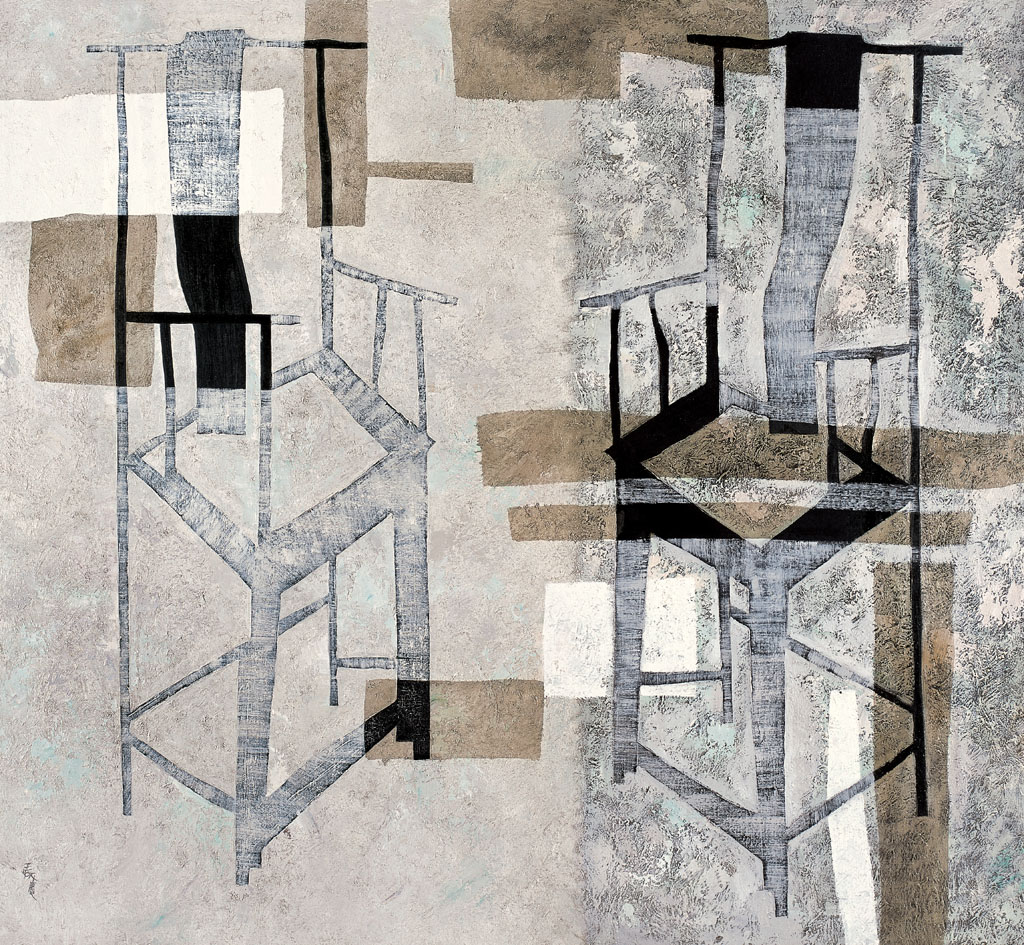 占据画面主要位置的是两把相向摆放的明式四出头冠帽椅,此外再没有描绘其它物象。色调基本以黑、白和一种混合调子组成,整体上控制在一个灰度里。而表面的一层白色,似乎玻璃上的灰尘或冰霜,朦胧模糊,横七竖八的色块,更强化了这种效果,加之其肌理变化莫测,使得观者在意欲看清后面的对象时,视线却被干扰。画面看似表现了对置的椅子,意象很单纯,实则是设计了一个小小的视觉陷阱,它们只是繁复的构成元素之一,这种“雾里看花”式的手法,在抽象与具象间张力十足,充分显示了画家个人语汇的形式之美,也带有某种隐喻意味,似乎代表了画家对传统文化在当代境遇的看法。