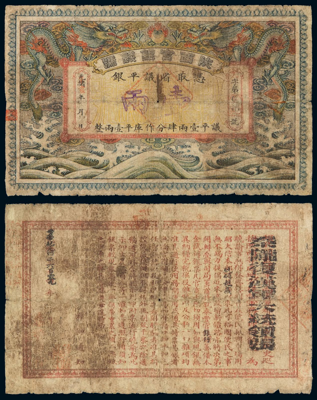 光绪改辛亥年(1911年)陕西官银钱号壹两银票一枚,俗称“陕西五彩龙票”,背面加盖“秦陇复汉军大统领张”、“统领起义”、秦丰官“银行”、“黄帝纪元四千六百零九”年,辛亥革命时期以空白陕西官银钱号银两票加盖发行,兼具清票与辛亥革命军票性质,此面额券目前所见不超过三枚,每枚均至为珍贵,七成新