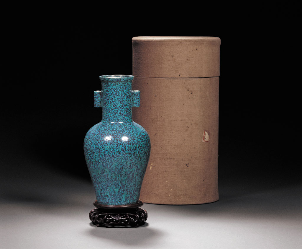 说明:器形仿自明宣德官窑青花贯耳瓶(参见《故宫博物院藏文物珍品大系——青花釉里红》上册,页98,图92),清雍正、乾隆两朝官窑造型相类者仅见于青花器,单色釉直颈贯耳瓶极为罕见,相当珍贵。