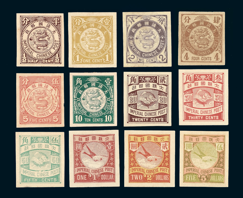 PR 1897年日本版蟠龙邮票无齿试色样票十二枚全套,此类样票存世稀少,国内外邮票拍卖偶见低面值单枚样票,全套样票除此之外未见记载,此套首次出现于2000年上海365bet足球投注网站_365bet体育在线网站_体育平台送365彩金