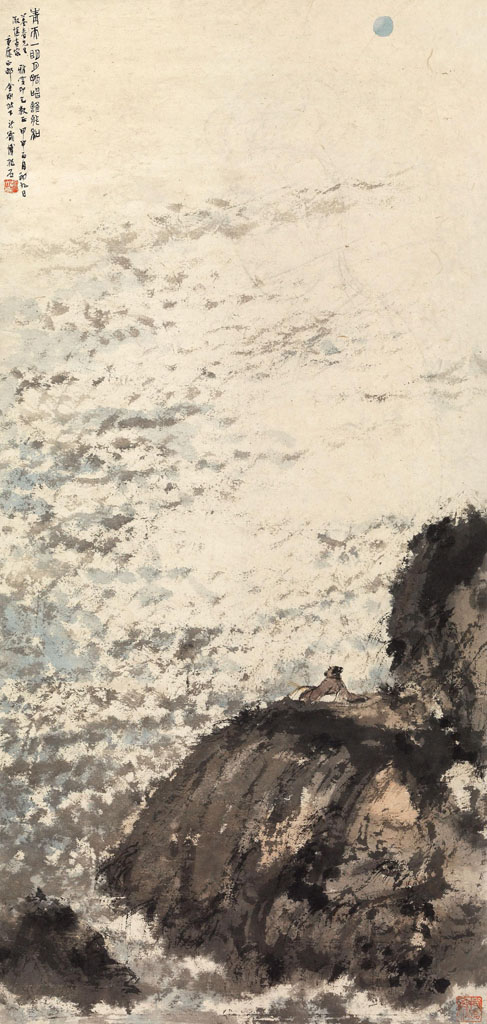 说明:1942年,傅抱石在《壬午重庆画展自序》中,介绍自己绘画题材的“第二条路线是构写前人的诗,将诗的意境,移入画面。”其中提到石涛的一首五绝,“盘礴万古心,块石入危坐,青天一明月,孤唱谁能和。”正是此画画意。傅抱石在自序中回忆以此诗入画的经过:“这诗有许多人爱读,我也爱读,尤其明了石涛环境的人一定更爱这首诗。我曾画了若干次,有两次的记忆尚新。三月间在中大,有一天宗白华先生到艺术系来,送拙着《大涤子题画诗跋校补》还我,当时他指出这一首,说:‘太好了,我最喜欢,你把它画出来吧!’我说:‘我也喜欢此诗,将来准备试一试。’第三天,我乘滑竿到柏溪分校去上课,从大竹岭过了嘉陵江,沿着江边逶迤起伏的小冈峦前进,距柏溪不远了,忽见巍然块石,蹲立江滨,向前望去,薄雾冥茫,远山隐如屏障。我想:若把这块石作中心,画一人危坐向远山眺视,下半作水景,不就是‘苦瓜诗意’吗?高兴!高兴!回家后,急忙如法炮制,下午四时许便题印完了……”此幅《青天明月图》无疑是画家“曾画了若干次”中的一幅。