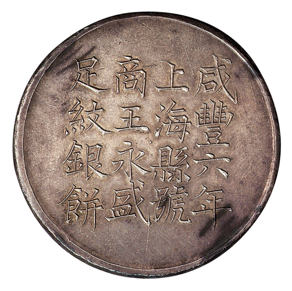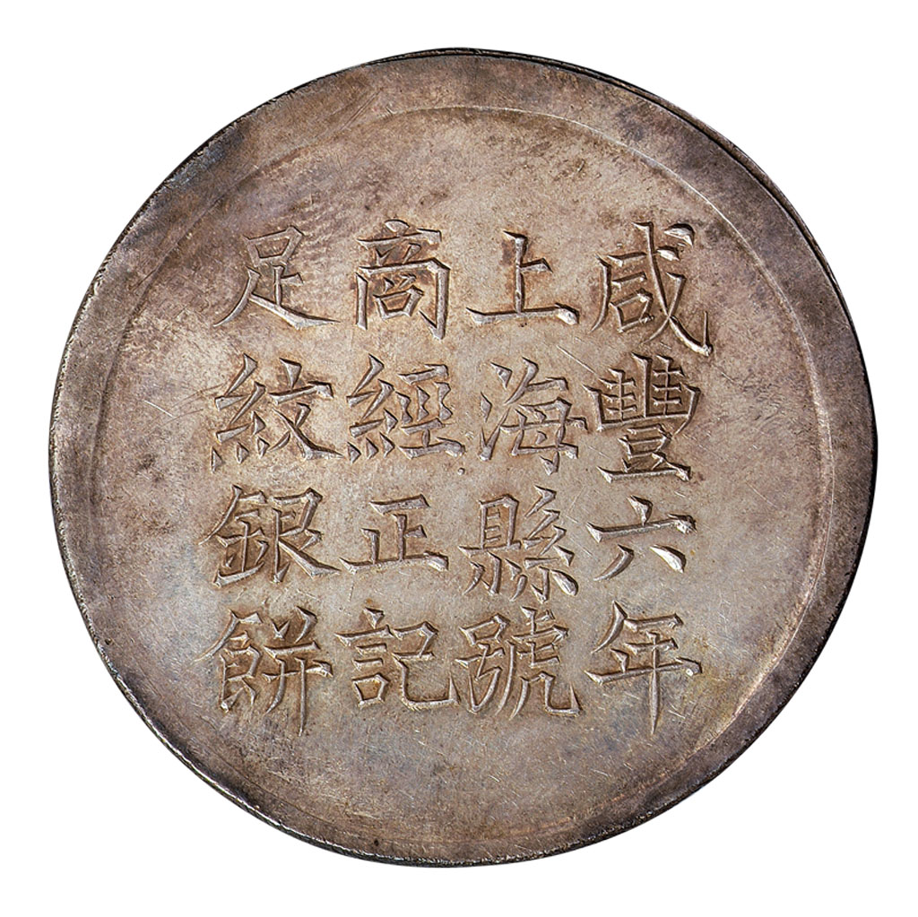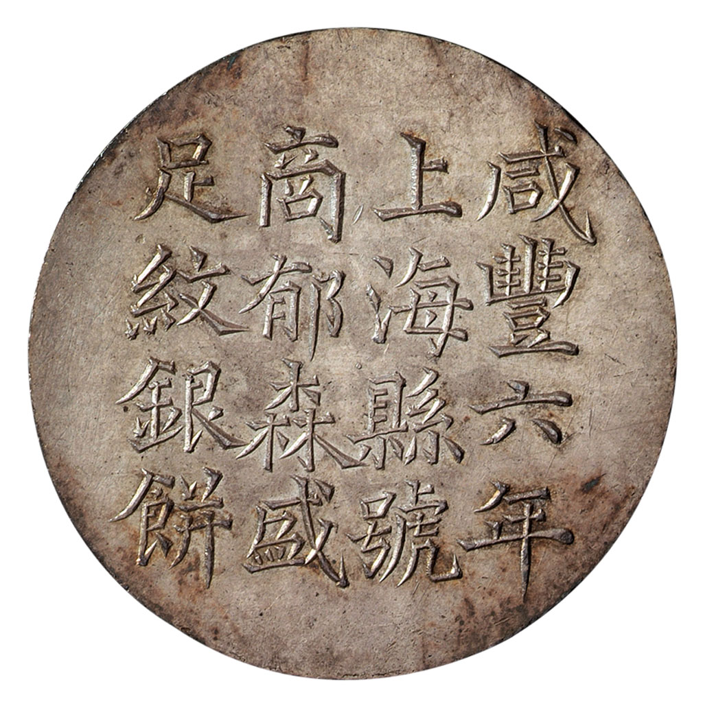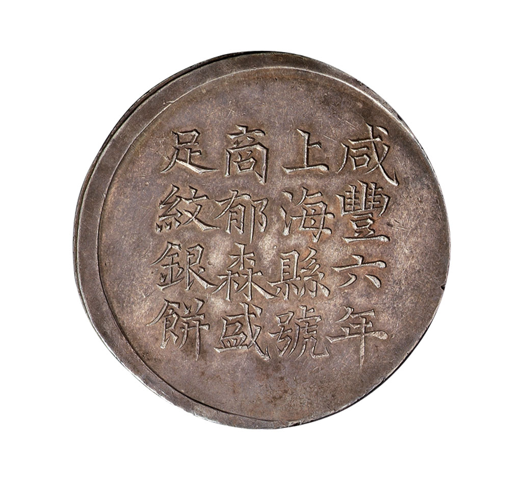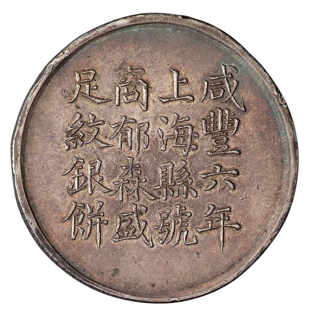咸丰六年上海“商王永盛匠万全”、“商经正记匠丰年”、“商郁森盛匠丰年”、“商郁森盛匠平正”壹两银饼各一枚;“商经正记匠万全”、“商郁森盛匠王寿”五钱银饼各一枚,计六枚全套,银饼上“万全”、“丰年”、“平正”“王寿”四种为匠名,以示对成色与重量负责,其中,“平正”存世最为稀少,论其稀少程度,近代着名钱币鉴藏家张璜在其着作《中国银圆及银两币目录》中说道:“作者亲近中国钱币近一甲子与此币之真品缘吝一面,虽屡经追求一真品之照片或拓片亦未能如愿,故此处暂无照片尚祈读者原谅。”此次上海银饼全套六枚同时出现且品相均属完美,部分带有原铸银光,实属可遇而不可求,征集自海外收藏家,甚为珍贵,近未使用至完全未使用品