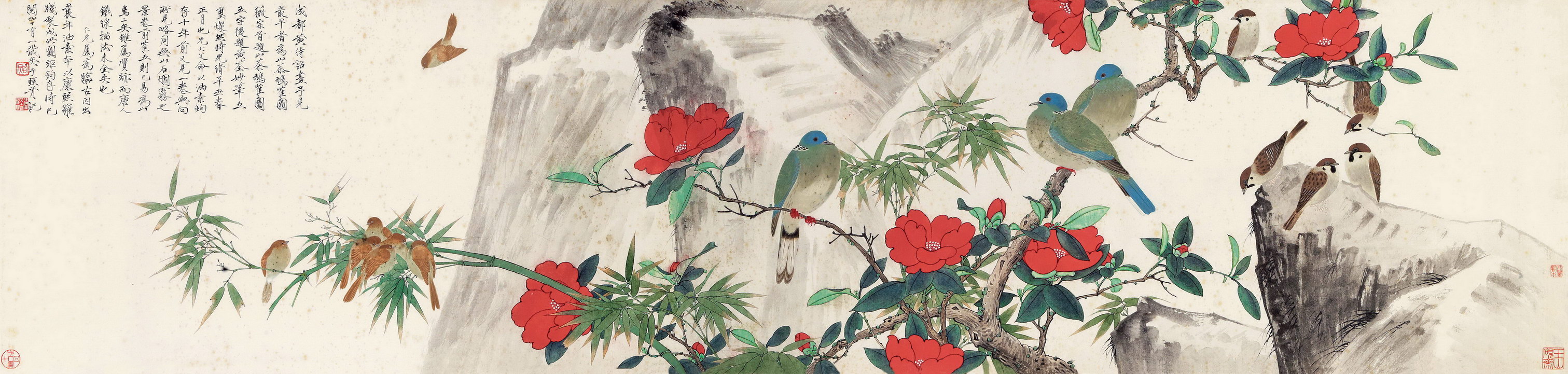 说明:《山茶鸠雀图》为于非闇1940年代初期一幅托言临古,实多出己意的花鸟精品:画面截取山间一角,以浅淡水墨勾勒坡石,前景一株山茶,花叶肥厚苍翠,山茶浓艳欲滴;三只斑鸠安处枝头;两竿修竹,穿插山茶的红花绿叶间;两组山雀,分别位于画面左右两侧,或飞或鸣,或聚或散,令静寂的山野小景,顿添无限生意。