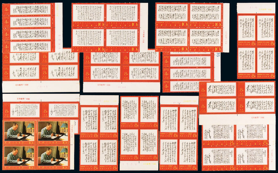 ★★1967年文7毛主席诗词邮票十四枚全四方连,除4分“长征”为带边纸及版号四方连外,其余均为带厂铭四方连,罕见,上中品