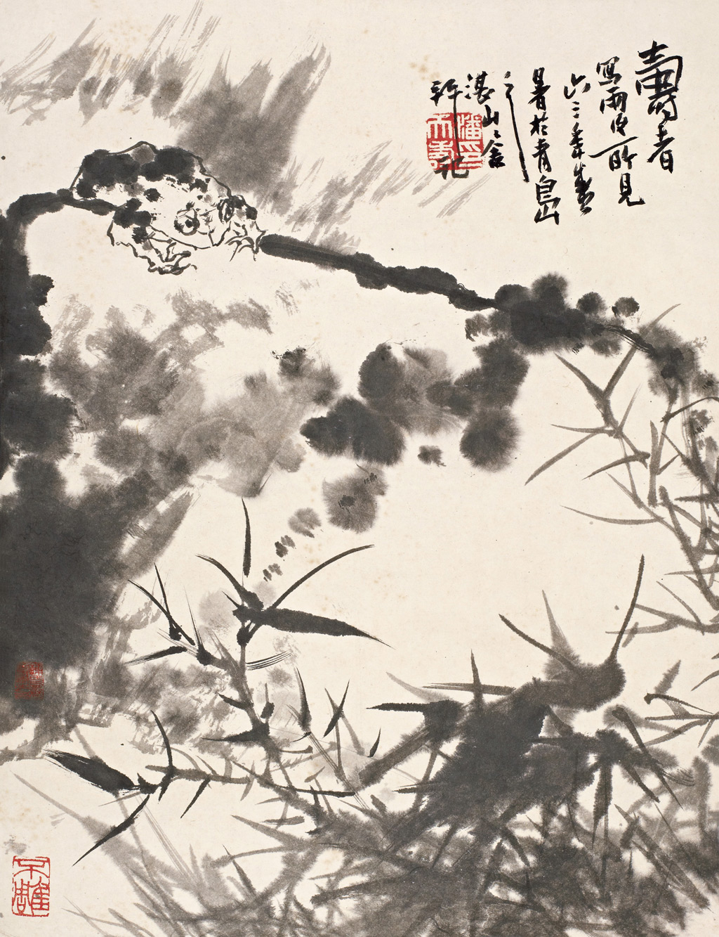 《雨后所见》极富水墨韵味,描绘的是盛夏雨后的一处小景。构图奇崛,画中方石几乎塞满整个画面,自左上向右下低斜,其轮廓仅以一根强有力的线条勾勒而成,然后用墨皴擦,巧妙地把浓烈、圆劲的苔点布置其中,多作留白,显得阔大沉浑。一蟾蜍伏于石之左上,造型奇特,用迟涩滞重的方笔折线勾画形体、眼睛、爪子,笔力抑扬顿挫,复以重墨点染,现其凸凹质感,寥寥数笔,极富神采。它正凝神下望,仿佛即将一跃而起。潘天寿反对“呆对着对象慢慢地描摹”,主张靠抓住刹那间的感觉,靠视觉记忆来真实再现所见之情景,此幅即雨后山中一段有趣的自然情态。画左上方用淡墨斜刷几笔,似为雨后远处若隐若现的植被。山石右下方是几丛翠竹,竹叶疏密聚散,穿插揖让,水墨滋润,以现丛丛叠叠之感。雨后清新空灵之气扑面而来。