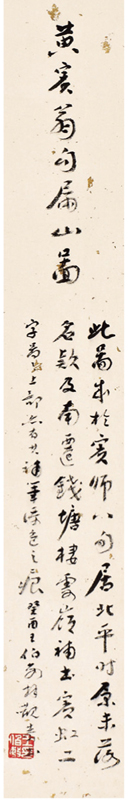 包首:(王伯敏题)黄宾翁《勾漏山图》。此图成于宾师八旬居北平时,原未落名款,及南迁钱塘栖霞岭,补书“宾虹”二字,图之上部亦有其补笔添色之痕。癸酉,王伯敏拜观恭书。