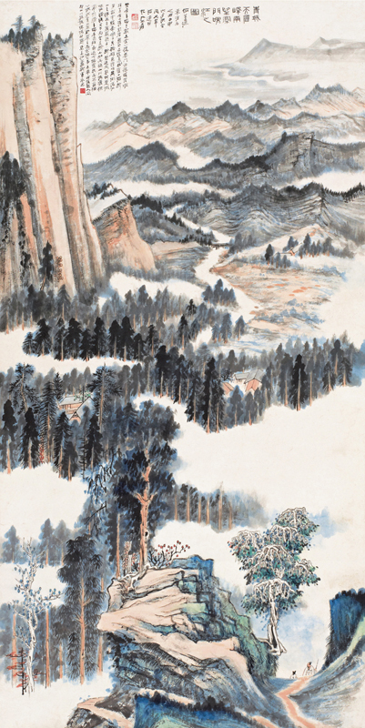 青城山位于四川都江堰市西南,乃道教名山,其景清幽,四面诸峰环绕,状若城廓,中间山谷、盆地多高大乔木遮蔽,宫观亭阁则掩映在浓荫翠盖之中。1943年末,张大千自敦煌返回四川,还居青城上清宫,翌年六月初,因青城近邻兼好友彭袭明“力怂恿之”,遂携儿辈畅游青城,本幅作于此行归后,画家站在天苍峰南面了望青城全景,视野中“断岸裁云,颓峰碍日,秀拔雄奇,腭咍莫测”,东向矗立的丈人峰耸然直插云霄,味江缭绕于断堑连冈间,隔江山色绵亘,南望目断,东南之极的鹿头山、熊耳山几不可辨。